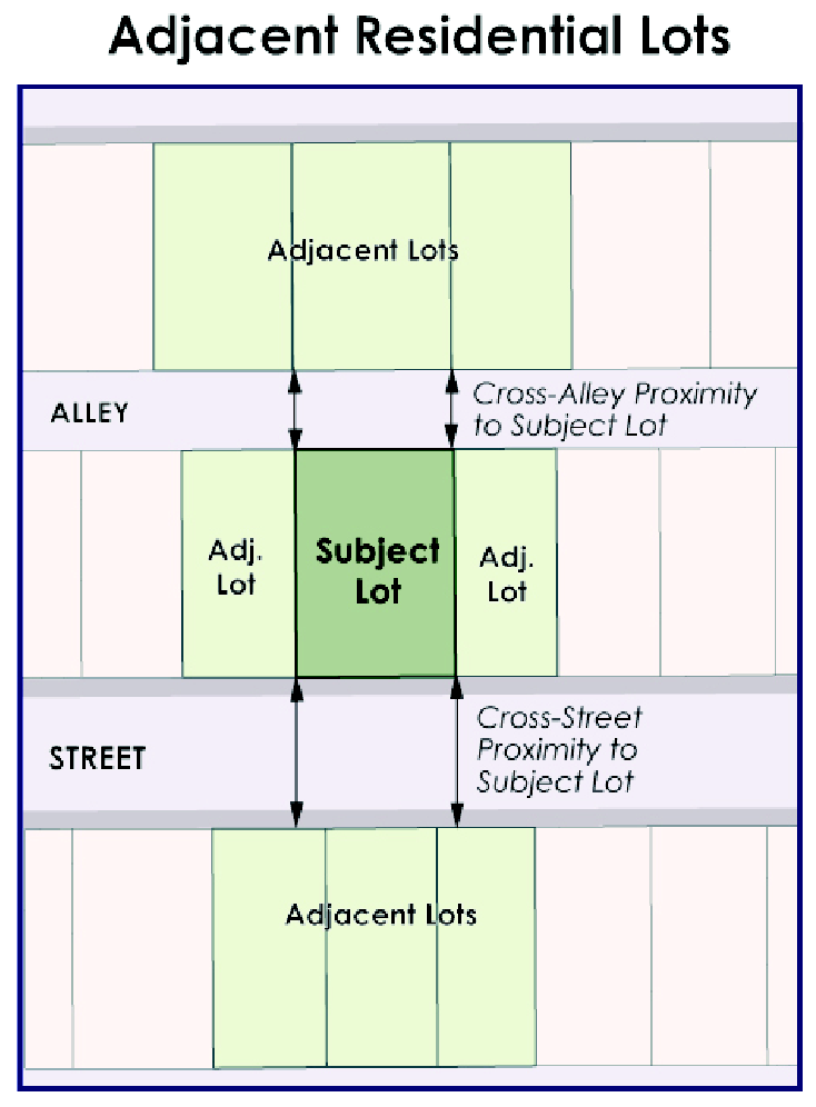 The subject lot and adjacent residential lots were created by (a) final subdivision map(s) recorded within the past ten (10) years. The term "adjacent residential lot" in this subsection means each lot zoned or used residentially that share a common property line or is separated by an alley including those which touch only at a corner. See Figure 4.1-3. This may include additional lots if deemed appropriate by the Director.