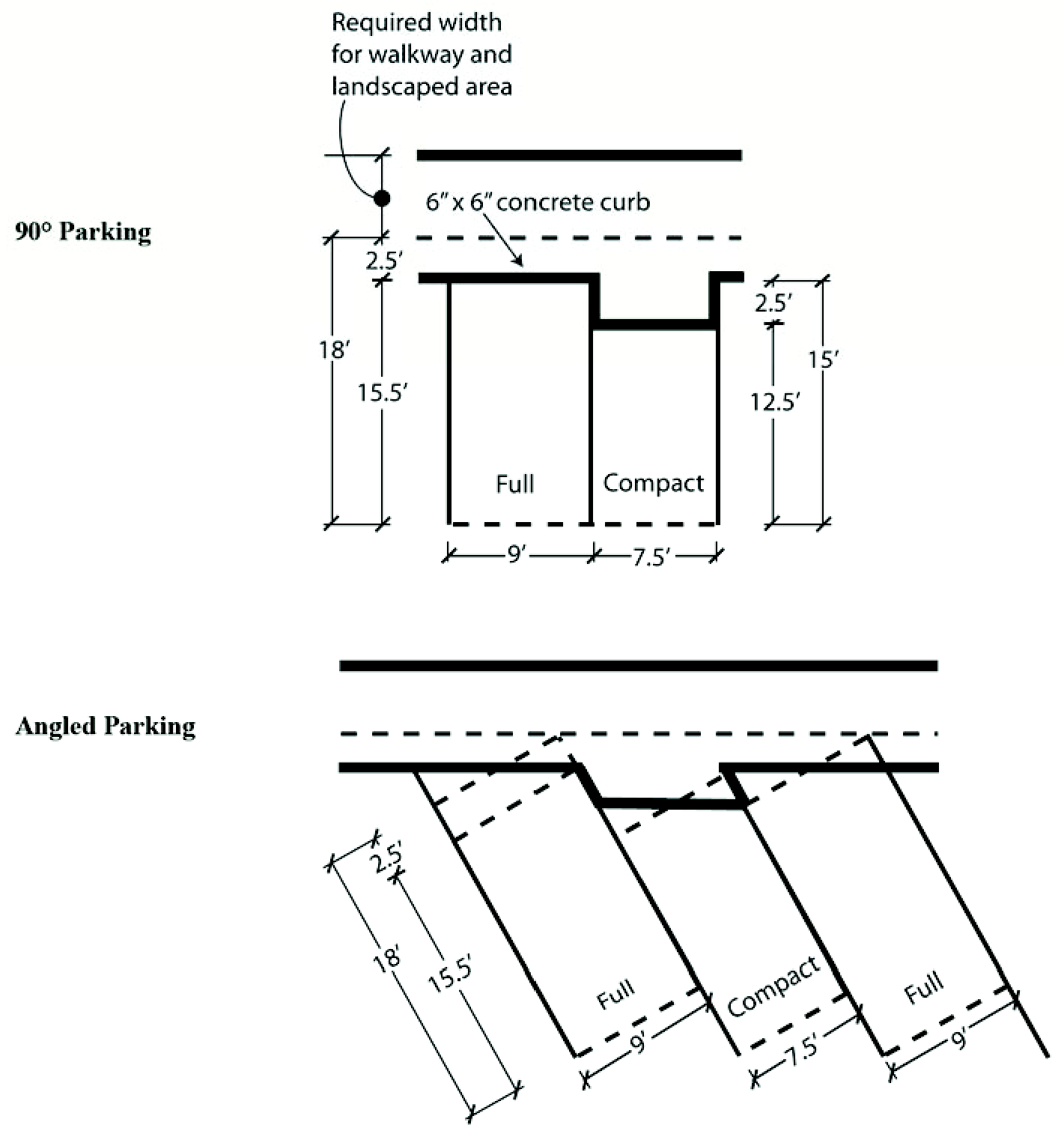 Full Size: Each space shall be a minimum of nine (9) feet wide by eighteen (18) feet long, including any overhang. See Figure 5.1-1.