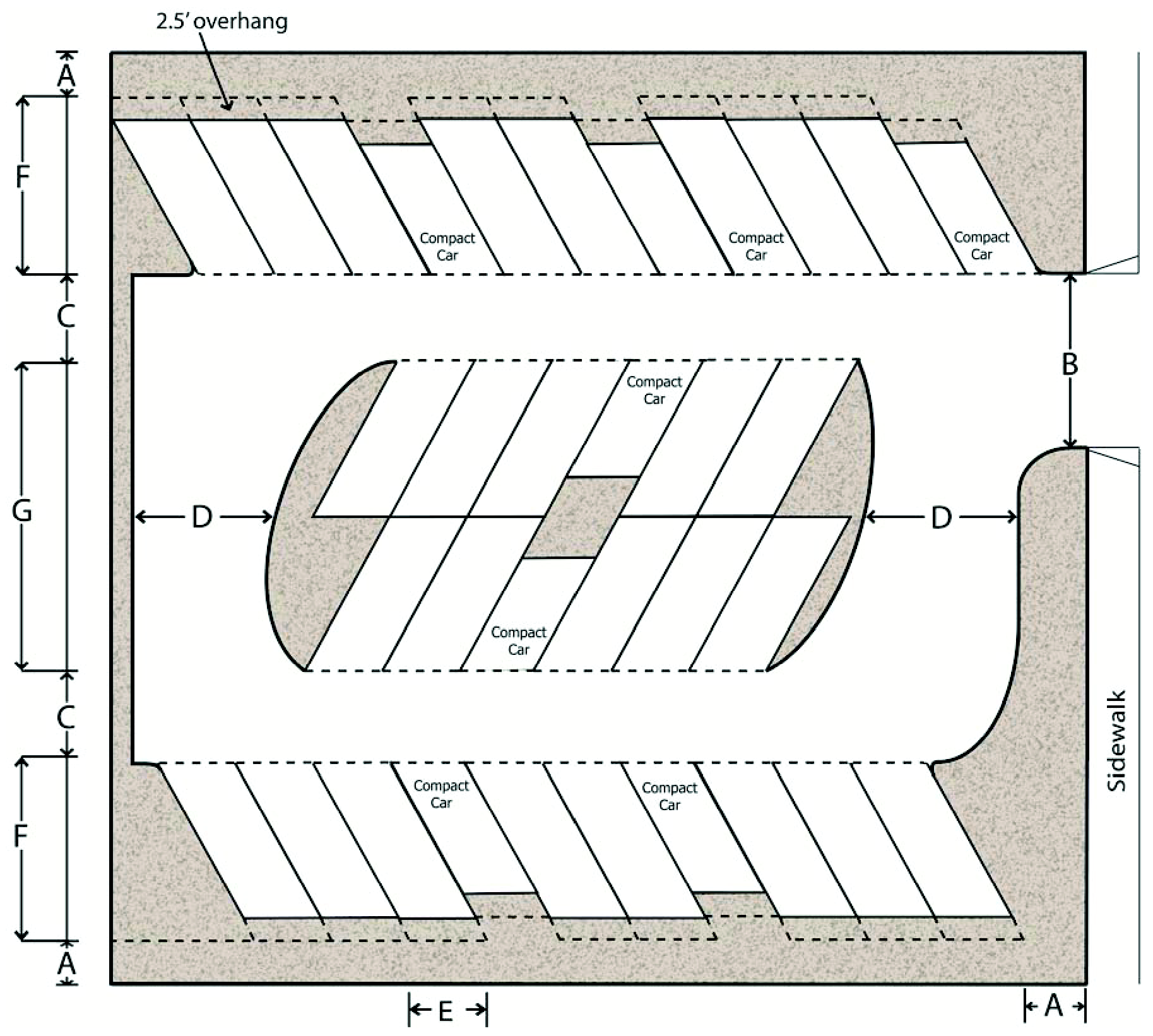 Overhang. Every parking space adjacent to a landscaped area or walkway shall utilize an overhang of two and one-half (2.5) feet. Full size spaces may be reduced to a dimension of nine (9) feet by fifteen and one-half (15.5) feet with a two and one-half (2.5) foot overhang. Compact spaces may be reduced to a dimension seven and one-half (7.5) feet by twelve and one-half (12.5) feet with a two and one-half (2.5) foot overhang. All overhang shall be added to the width of any required landscaped area or walkways.