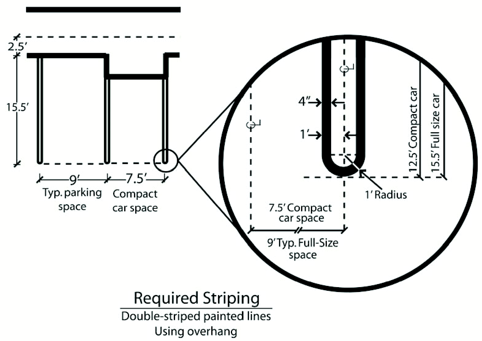 Compact: Each compact space shall be a minimum of seven and one-half (7.5) feet wide by fifteen (15) feet long, including any overhang.