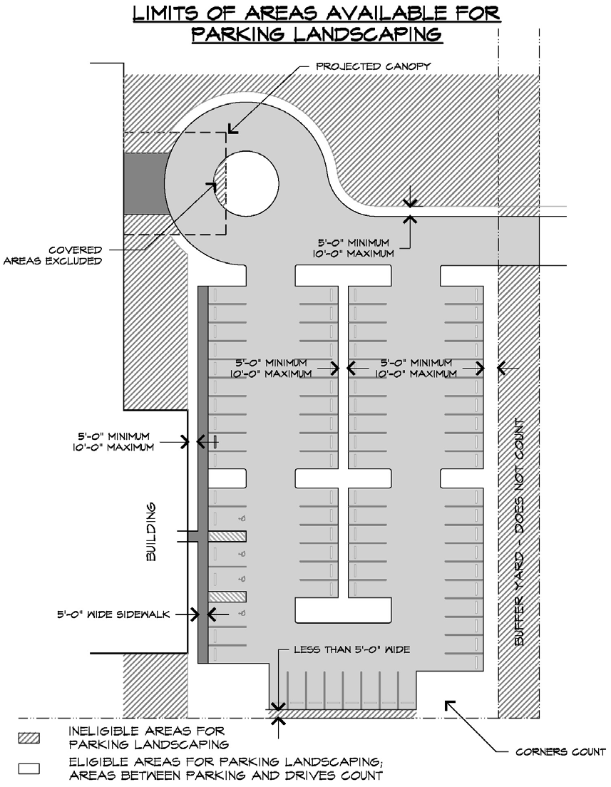 The new use shall be responsible for all the required buffer where no solid fence exists; but all existing canopy trees, shrubs or understory trees within ten (10) feet of the property line may be counted up to fifty percent (50%) of the required plant material.