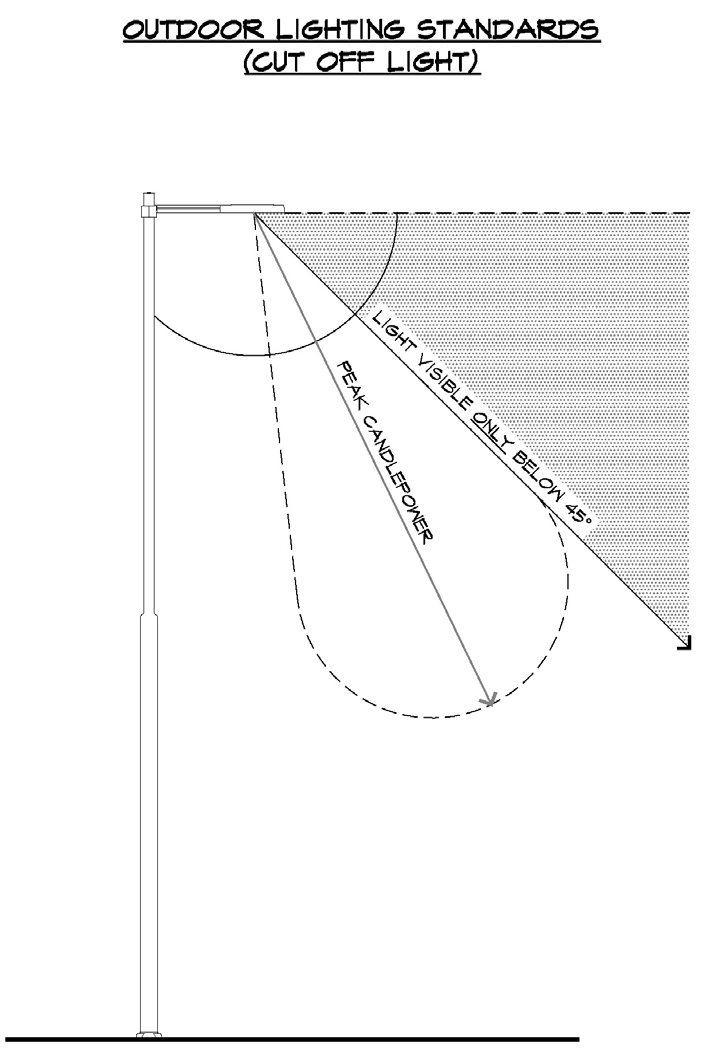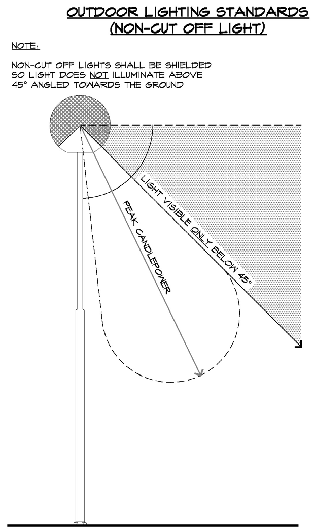 Outdoor lighting, other than that used for public athletic facilities, shall be designed, located, and mounted at a maximum height of eighteen (18) feet for noncutoff lights and thirty-five (35) feet for cutoff lights. All lighting shall be shielded so that light does not illuminate above 45° angled towards the ground.