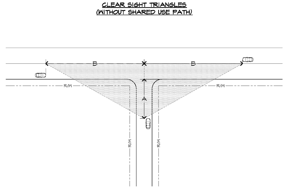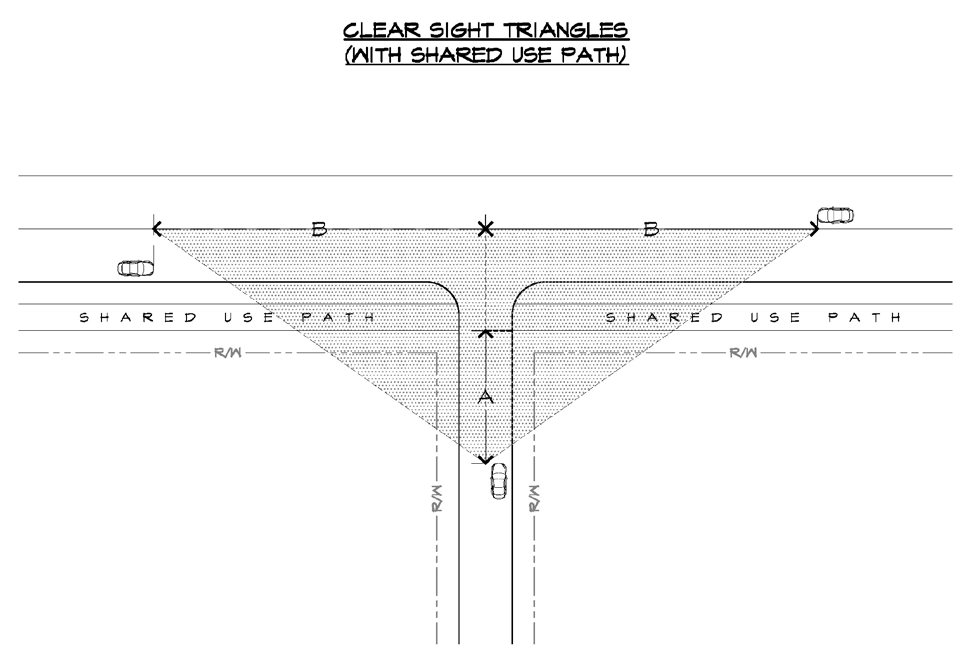 *A is the distance from the edge of pavement of the street, bicycle path, or shared use path, as applicable, to the point on the drive at which clear sight distance is required.
