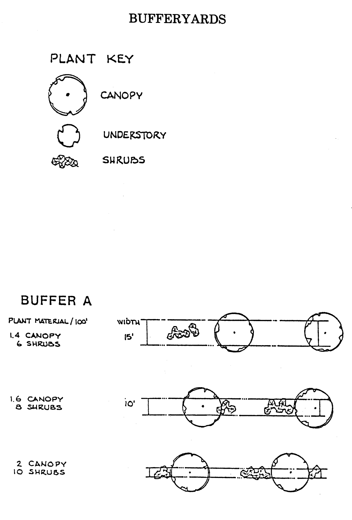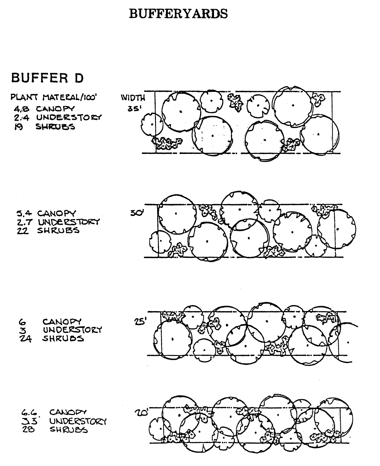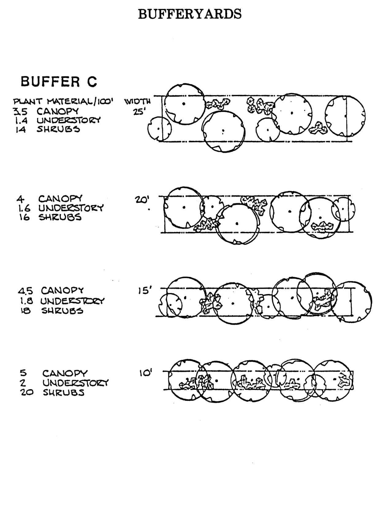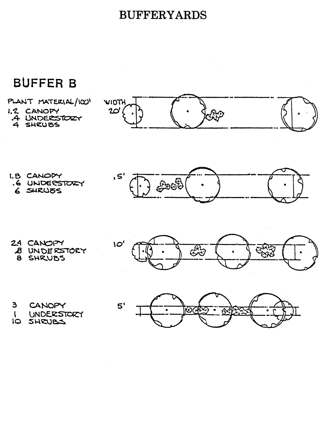 Each of the buffers required in Sections 114-126 and 114-127 shall be installed in accordance with the standards set forth in this section. The illustrations that follow this section specify the number of plants required per one hundred (100) linear feet. To determine the total number of plants required, the length of each side of the property requiring a buffer shall be divided by one hundred (100) and multiplied by the number of plants shown in the illustrations that follows this section. Any buffer area that overlaps another buffer area shall be subtracted from the total to avoid double counting. The arrangement of the plants in the bufferyard shall be determined by the developer.