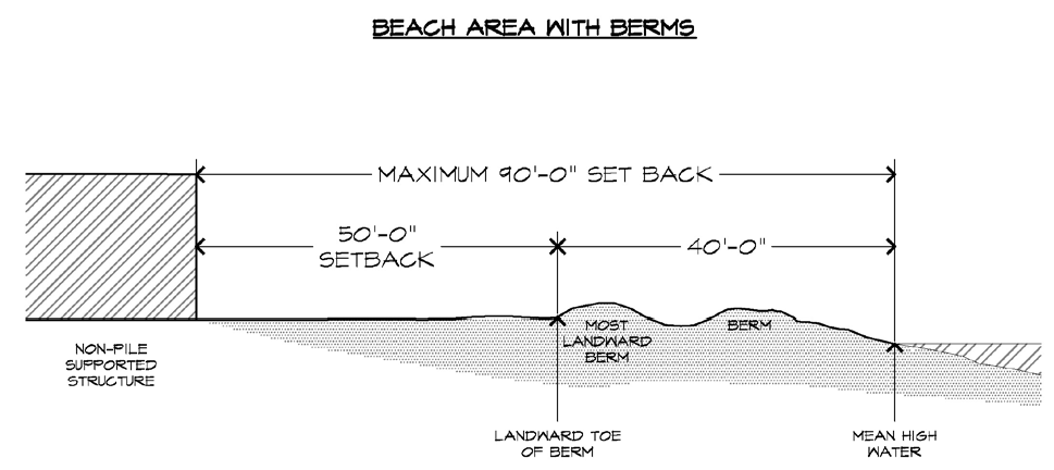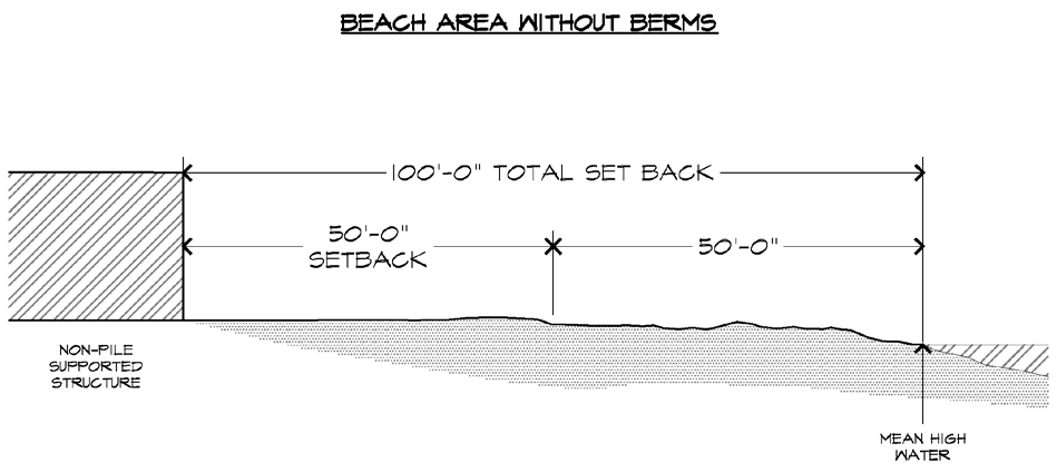 The 50-foot setback shall be measured from either the landward toe of the most landward beach berm or from 50 feet landward of MHW, whichever is less. The maximum total setback shall be 100 feet from MHW.