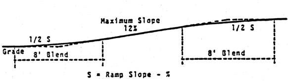 4. Short ramps, under 65′ in length shall not exceed a maximum slope of 16% with a 10′ blend.