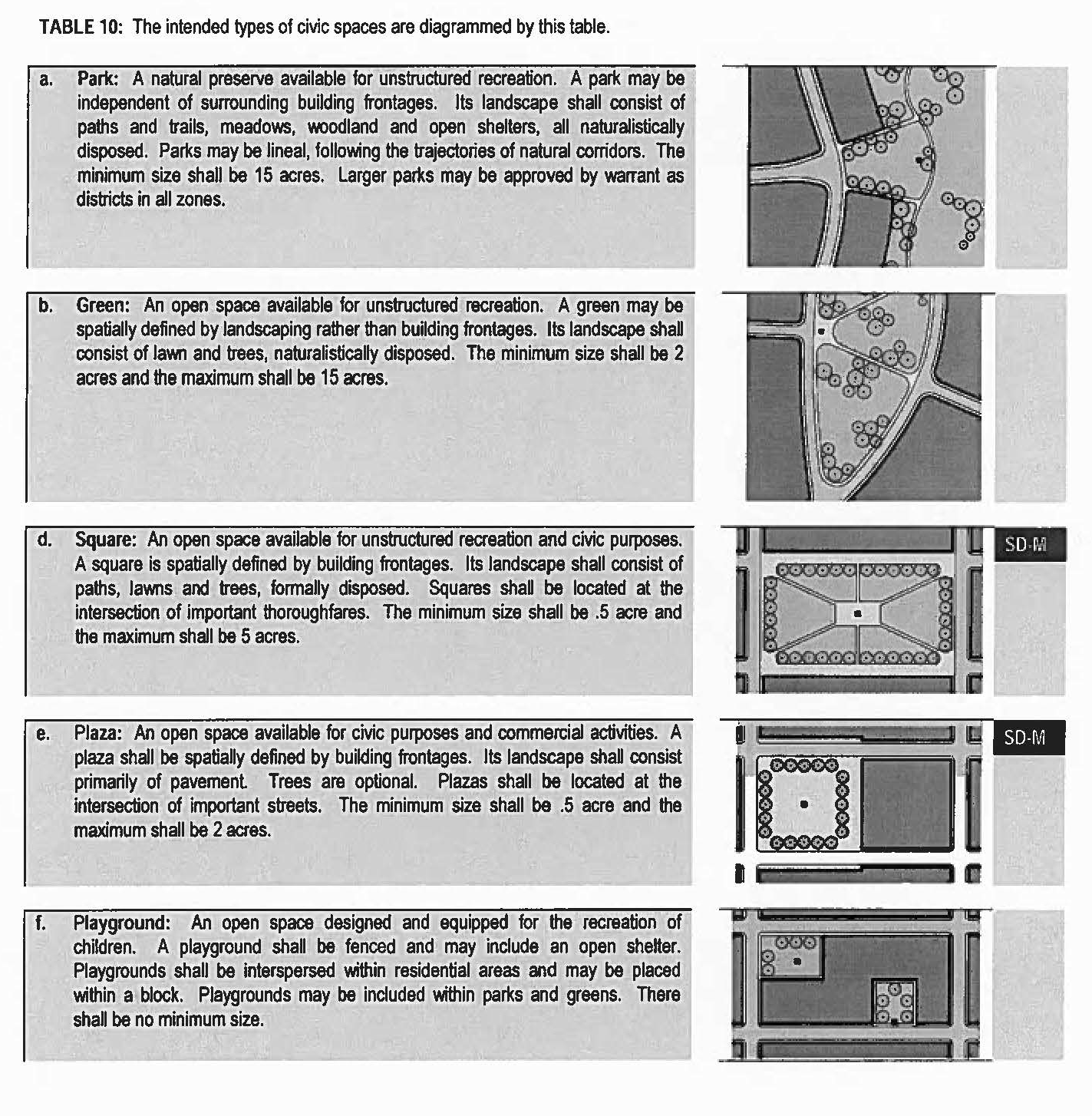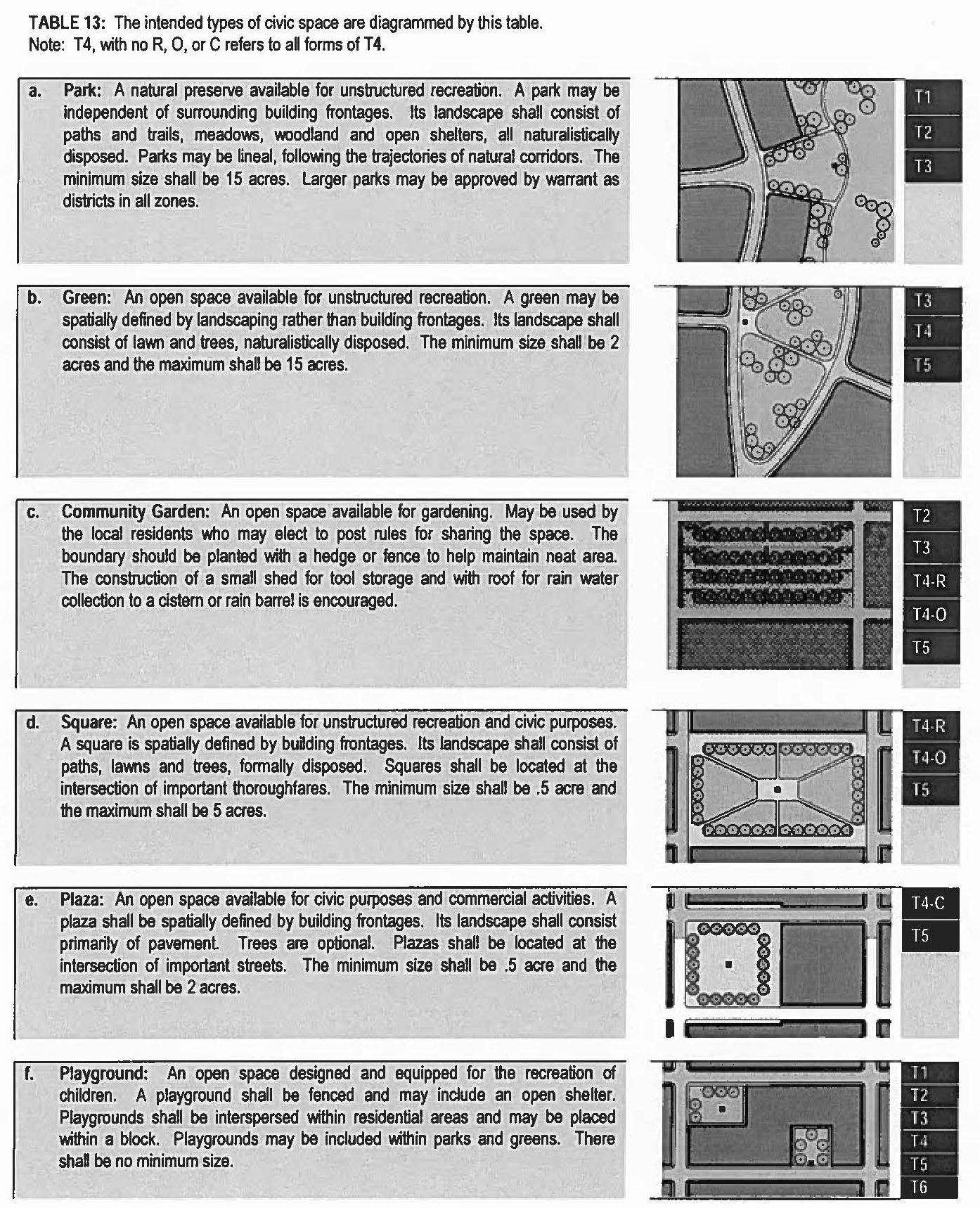 Type: A form category determined by function, disposition, and configuration, including size or extent. There are community types, street types, and civic spaces types.