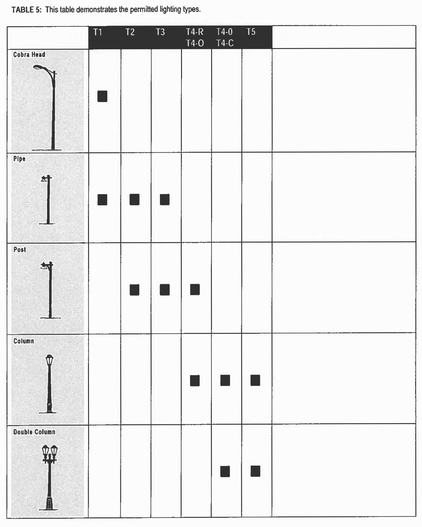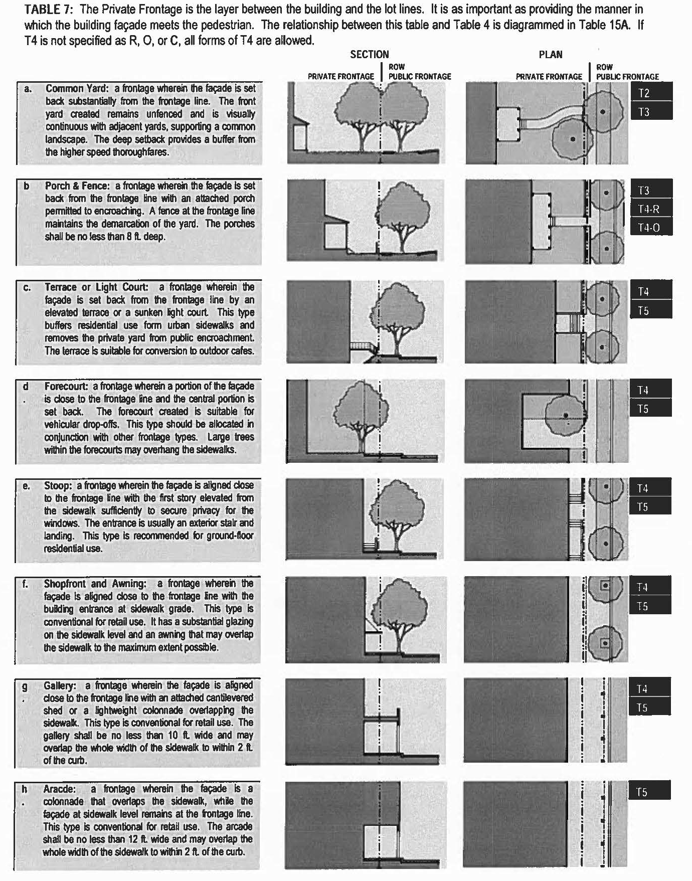 Transect Zone (T-Zone): Transect Zones are administratively similar to the land use zones in conventional codes, except that in addition to the usual building use, density, height, and setback requirements, other elements of the intended habitat are integrated, including those of the private lot and building and the enfronting public streetscape. The elements are determined by their location on the transect scale. The T-Zones are: T1 (Natural), T2 (Rural), T3 (Sub-Urban), T4 (General Urban), T5 (Urban Center), and T6 (Urban Core) (see Table 1). NOTE: Montgomery, at the time of adoption of this Code, does not have sufficient density to have property zoned as T6.