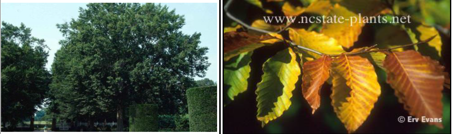 | American beech | Fagus grandifolia | 50-80 | 40-60 | Sun to partial shade; moist, well-drained soil | Dense; broad with wide spreading crown | Deciduous; native; casts very dense shade; shallow roots; difficult to grow plants underneath; seeds poisonous if ingested (low-toxicity); no serious pests; younger trees hold leaves in winter | ![]() |