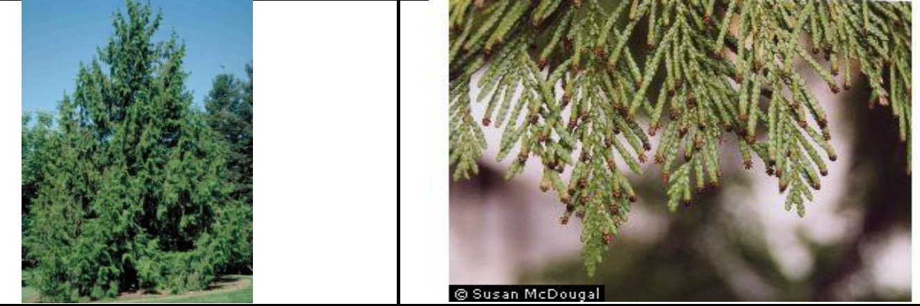 | Giant arborvitae, Western red cedar | Thuja plicata | 50-80 | 15-25 | Sun to partial shade; moist, well-drained soil but does well in clay; needs protection from wind | Conical; narrow to broad pyramidal | Evergreen; cone production begins at age 10-20 years; bagworms can be a problem | ![]() |