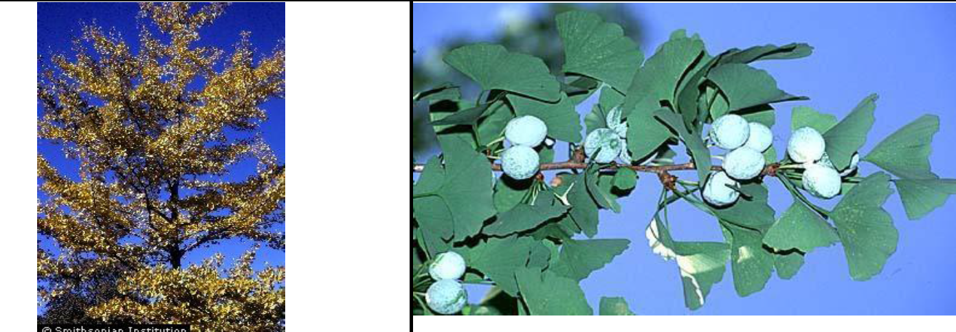 | Ginkgo, Maidenhair tree | Ginkgo biloba | 40-70 | 20-40 | Sun; range of soil types except wet soil | Irregular horizontal branches; pyramidal | Deciduous, plant only male trees; messy fruit; drought, heat, air pollution, and salt tolerant; outer pulp of seeds and raw seed kernel are poisonous if ingested in large quantities | ![]() |