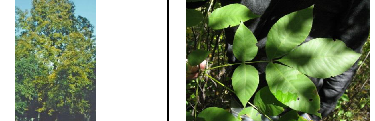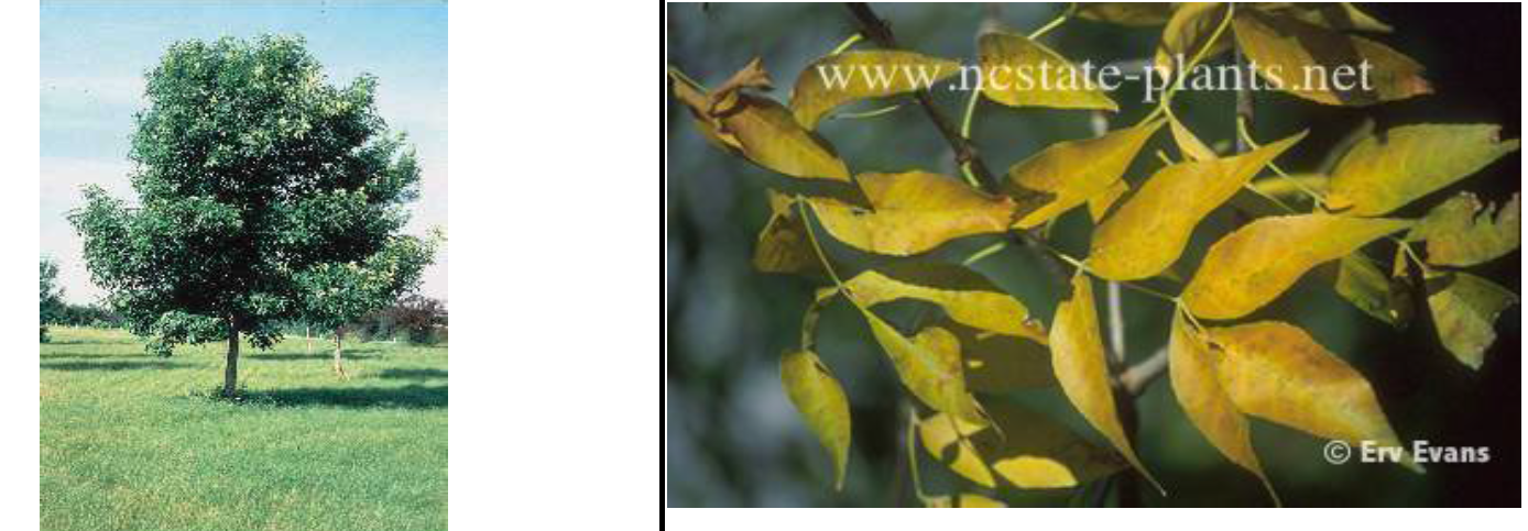 | Pignut hickory | Carya glabra | 50-60 | 25-35 | Sun to partial shade; range of soil types, however, prefers well-drained acidic soils | Regular, open, oval head; slender, contorted branches | Deciduous; drought tolerant; deep taproot | ![]() |