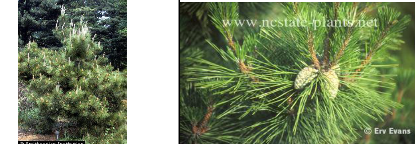 | Japanese black pine | Pinus thunbergiana | 40-70 | 15-25 | Sun; range of soil types but prefers well-drained soil | Pyramidal when young; irregular, asymmetrical, spreading crown with pendulous branches with age; dense | Evergreen; heat and drought tolerant; very tolerant to salt spray | ![]() |