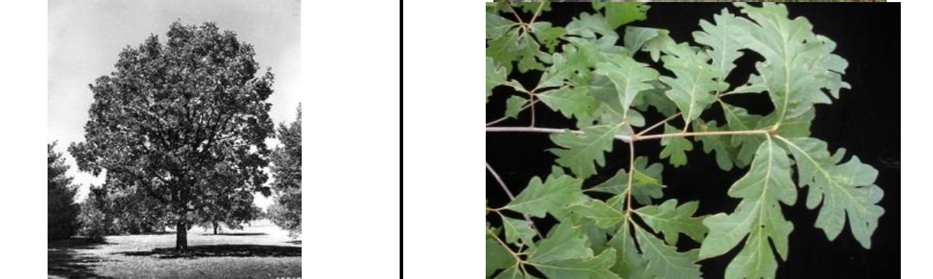 | Oak: White oak | Quercus alba | 60-100 | 50-90 | Sun; prefers moist, well-drained soil but tolerates a range of soil types, including clay | Pyramidal in youth; broad crown with age; massive, spreading tree with thick trunk | Deciduous; native; avoid planting near paved areas; does not withstand construction damage well; drought tolerant; acorns and young leaves are poisonous if ingested (low-toxicity) | ![]() |