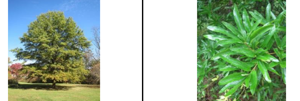 | Oak: Willow oak | Quercus phellos | 60-80 | 30-40 | Sun; prefers moist, well-drained soil, but will grow in a wide range of soil conditions, including compacted soil | Conical in youth; rounded crown; dense | Deciduous; native; tolerant of heat, drought, air pollution, and standing water; acorns and young leaves are poisonous if ingested (low-toxicity) | ![]() |