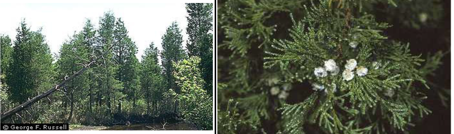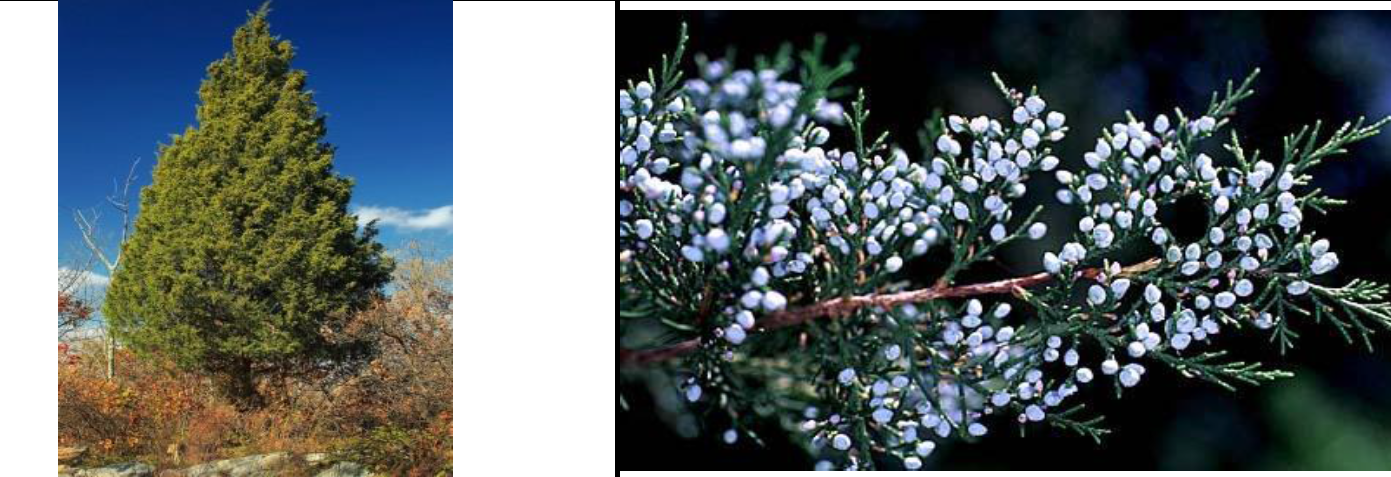 | Eastern redcedar | Juniperus virginiana | 30-40 | 42663 | Sun; prefers well-drained soil but tolerates wide range of soil types | Densley pyramidal; becomes irregular and slightly pendulous with age | Evergreen; native; cones (resemble berries) and leaves are poisonous if ingested (low-toxicity); drought and heat tolerant; may be susceptible to bagworm | ![]() |