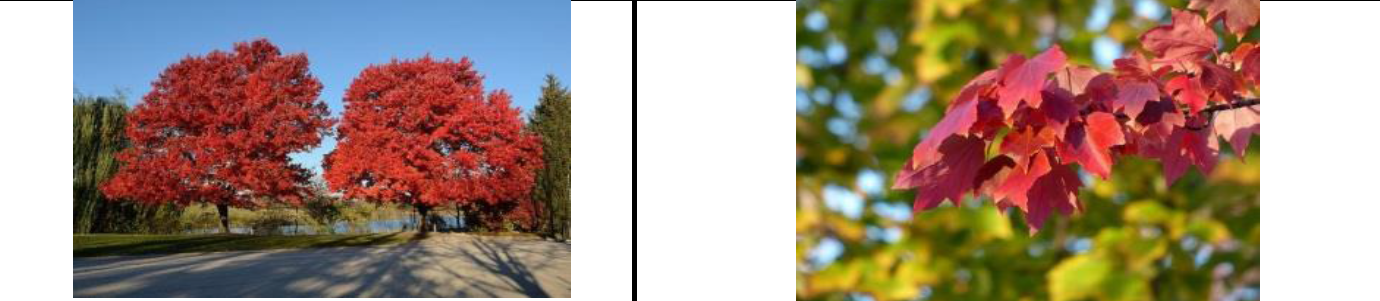 | Red maple | Acer rubrum | 40-60 | 25-45 | Sun to shade; range of soil types | Pyramidal when young; ascending branches with an irregular, rounded crown | Deciduous; native; some air pollution tolerance | ![]() |