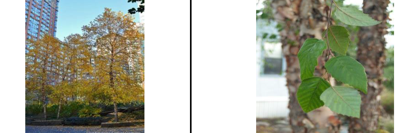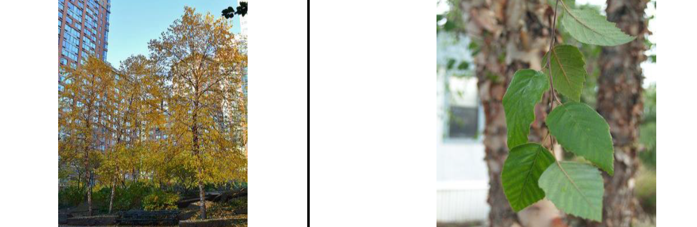 | River birch | Betula nigra | 40-70 | 20-60 | Sun to partial shade; moist, well-drained soil | Multi-stemmed, pyramidal in youth, rounded at maturity | Deciduous; native; best not to prune in spring - sap "bleeds"; heat tolerant | ![]() |