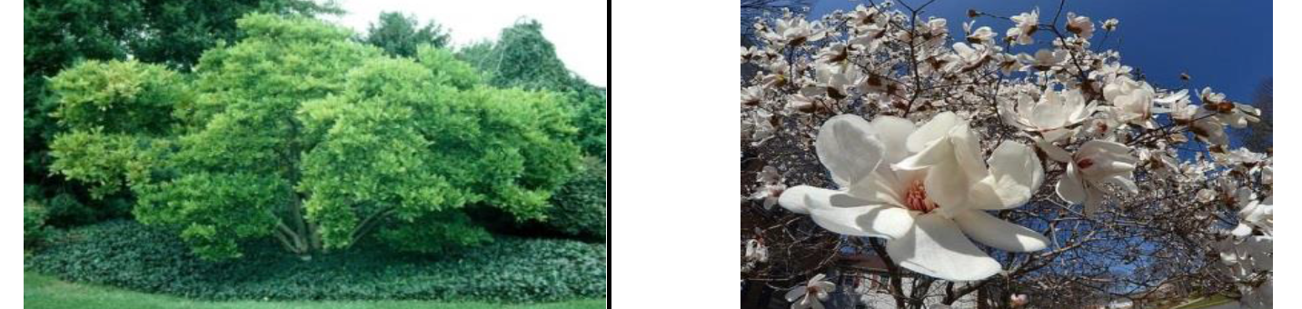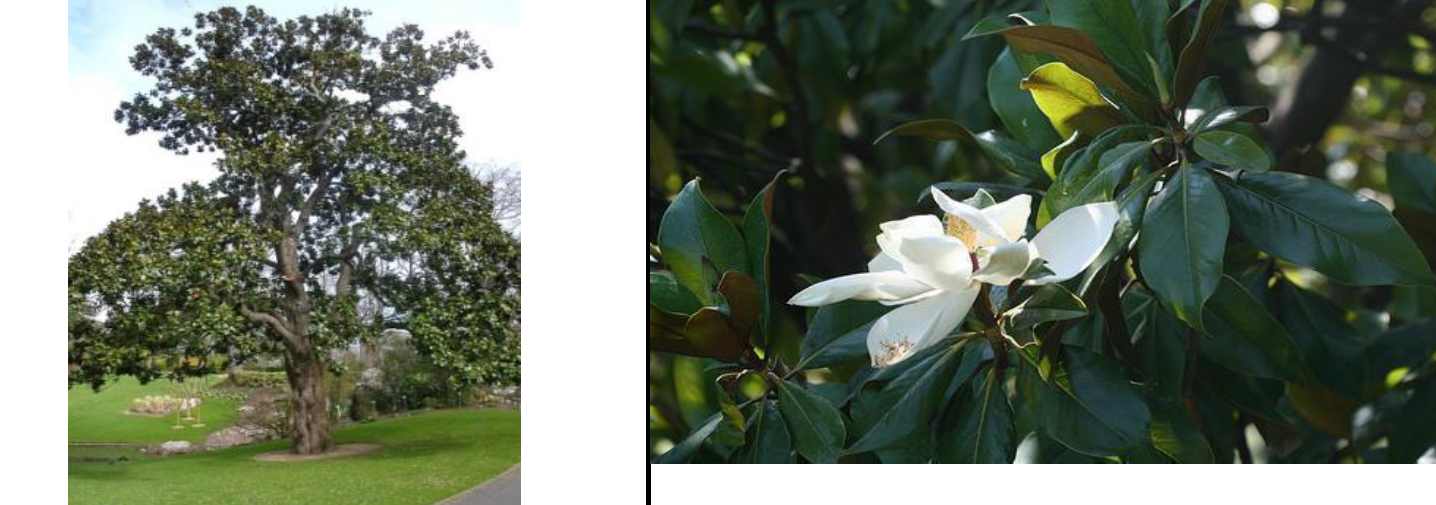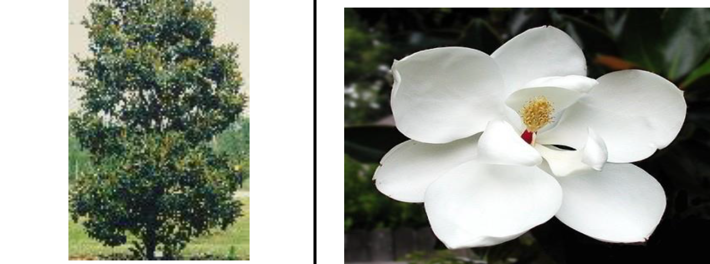 | Southern magnolia | Magnolia grandiflora | 40-80 | 25-40 | Sun to partial shade; well-drained soil; tolerates high moisture | Symmetrical, sweeps to ground | Evergreen; native; dense and shallow roots make it difficult to grow plants; should be planted where lowest branches can grow to ground; difficult to grow anything underneath | ![]() |