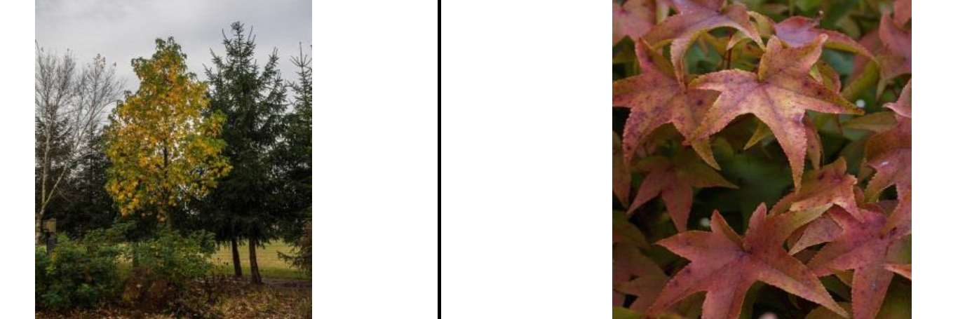 | Sweetgum | Liquidambar styraciflua | 60-100 | 50-75 | Sun to partial shade; dry to moist soil | Pyramidal in youth; upright; semi-conical to spreading with age | Deciduous; non-fruiting variety, such as Rotundiloba, preferred; resistant to insect attack; provide large areas of shade; capable of fixing nitrogen in soil | ![]() |