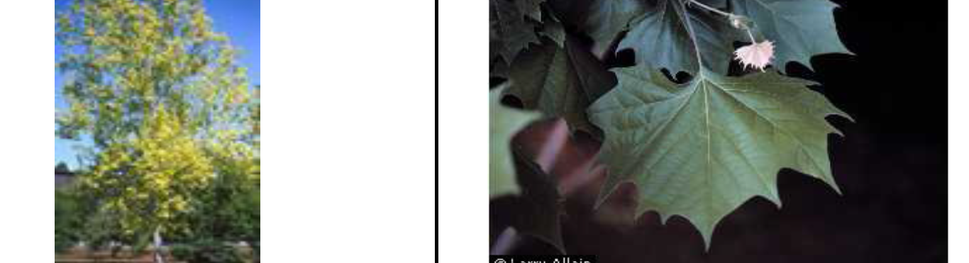 | Sycamore | Platanus occidentalis | 70-100 | 60-80 | Sun to partial shade; prefers moist, well-drained soil | Large massive trunk; wide-spreading open crown; crooked branches | Deciduous; subject to anthracnose and lace bugs | ![]() |