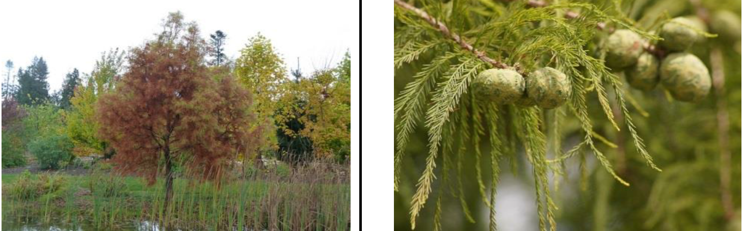 | Bald cypress | Taxodium distichum | 50-100 | 20-30 | Sun; grows in variety of soils (wet, dry, and compacted) | Pyramidal in youth; broad open crown at maturity | Deciduous; native; casts light shade; cypress knees produced when grown in or near water; large taproot; heat and drought tolerant; no serious pests | ![]() |