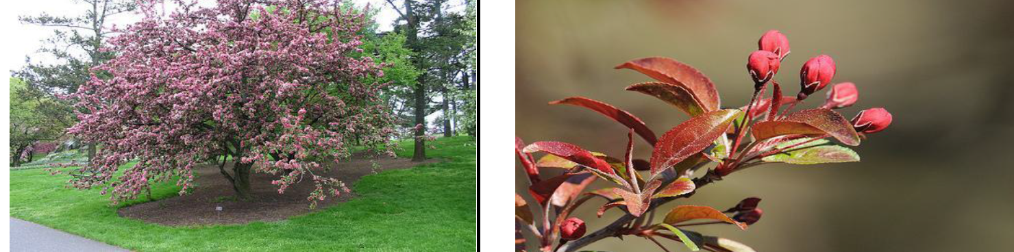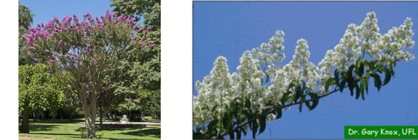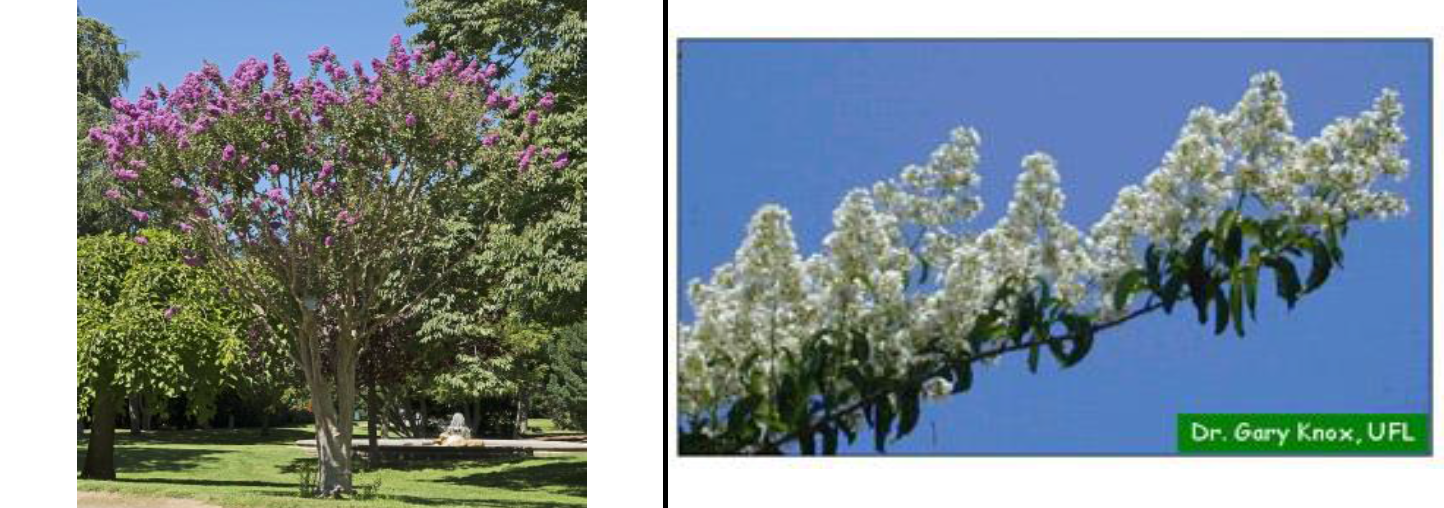 | Crepe (Crape) myrtle [Basham Pink, Fantasy, Kiowa, and other large varieties] | Lagerstroemia (Large Varieties) | 35-50 | 25-35 | Six hours or more of direct sun to maximize blooming; sand, loam, or clay | Multi-stemmed; rounded crown; dense branching | Deciduous | ![]() |