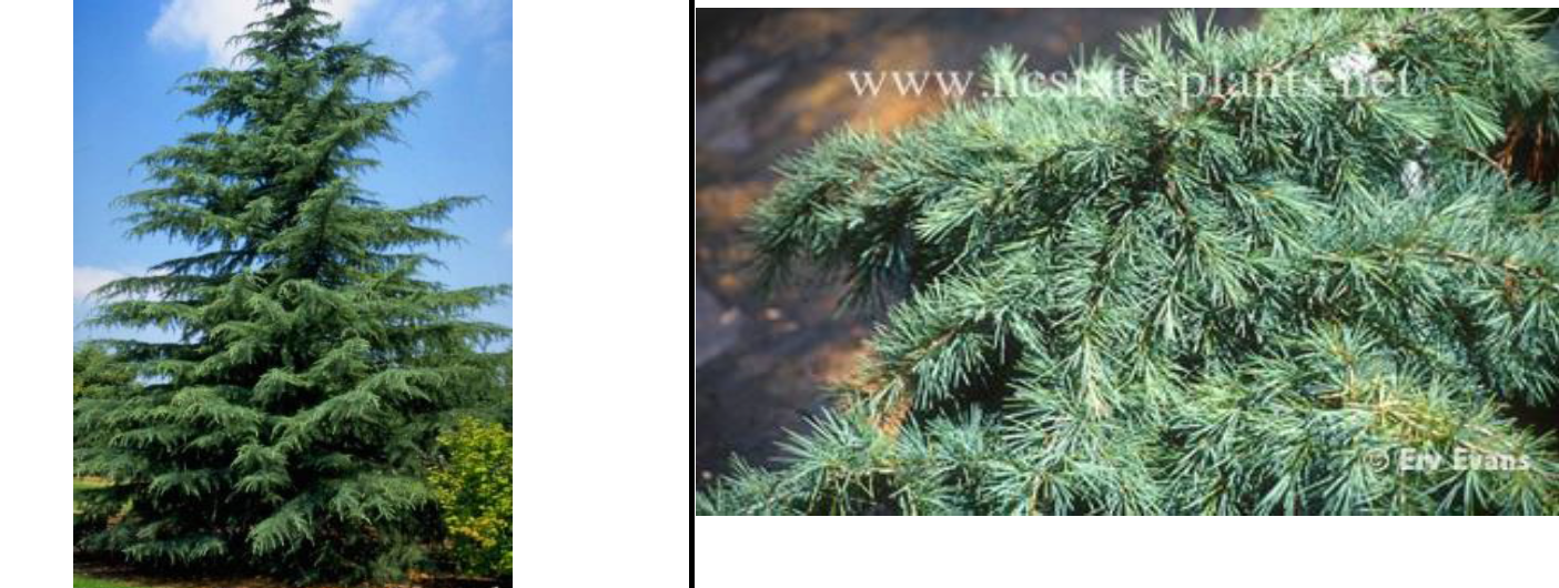 | Deodar cedar | Cedrus deodara | 30-50 | 30-40 | Sun to partial shade; well-drained, somewhat dry site; needs protection from wind | Pyramidal with pendulous branches | Evergreen; cones on female tree | ![]() |