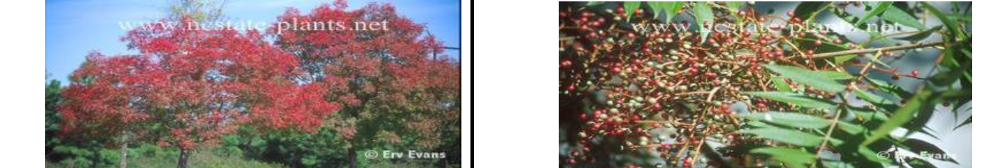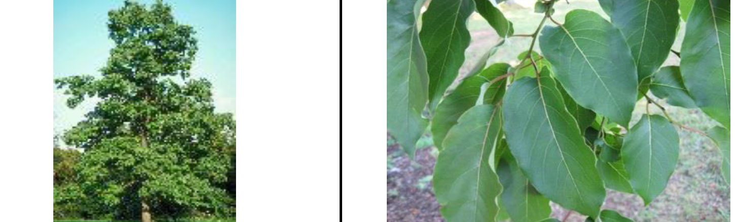 | Black gum, Black tupelo, Sour gum | Nyssa sylvatica | 40-60 | 20-30 | Sun to partial shade; prefers moist, well-drained soil; provide shelter from wind | Pyramidal when young; opens with age; some branches are pendulous | Deciduous; native; long taproot; spectacular fall color, no serious pests | ![]() |