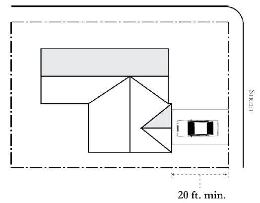 Garage and Carport Setbacks. The entrance of a garage or carport shall be setback a minimum of twenty feet from the edge of a sidewalk or public right-of-way, whichever is closer. See Figure 18.16-1.