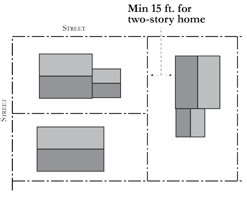 Reverse Corner Lots — RDM and RDH Zoning Districts. In the RDM and RDH zoning districts, a fifteen-foot minimum side yard setback is required when the side yard of a two-story residence is adjacent to a rear yard on an adjoining lot. See Figure 18.16-2.