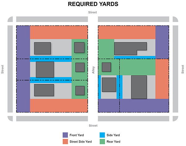 | Stairs/Steps Max. 5’ encroachment; Max. 4’ encroachment in interior side yard for access provided to below-grade floors, otherwise max. 3’ encroachment; Unroofed only | Y | Y | Y | Y |
