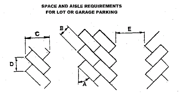 | Angle Of Parking (A) | Stall Width (B) | Stall Depth (C) | Curb Length (D) | Driveway Width (E) |