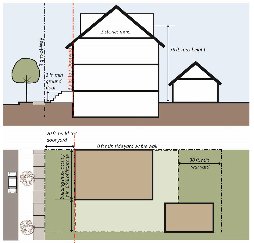 Intent. The RM-1 district is intended for a mixture of housing types along corridors, adjacent to single-family detached neighborhoods, and near the downtown. Infill development consisting of urban-style attached residential units including townhouses, flats, and small apartment buildings should be designed to fit the context of the adjacent residential neighborhoods.
