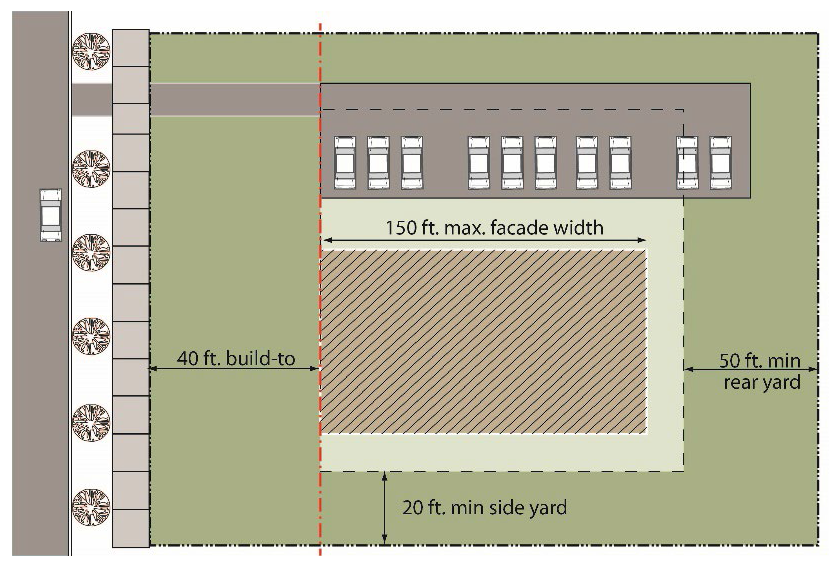 Each square foot of pavement which encroaches into a required greenbelt must be replaced on another side of the same building. Site plans must clearly dimension landscaped greenbelts and provide calculations in instances of greenbelt transfer.