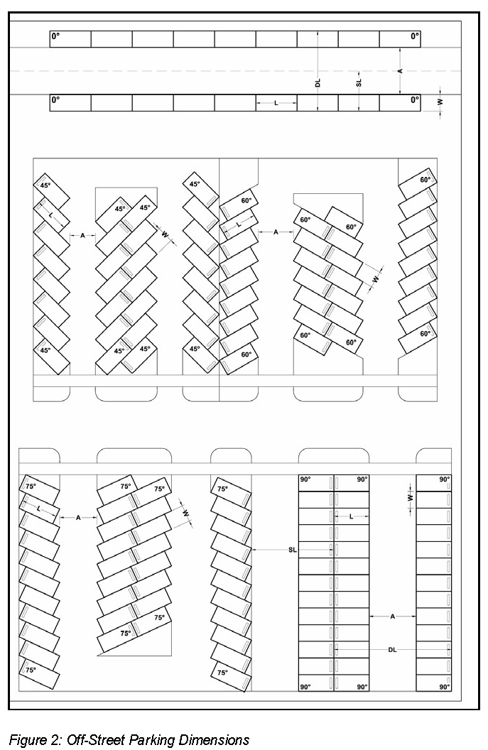 Off-street parking spaces shall be designed in accordance with figure 2 (off-street parking dimensions).