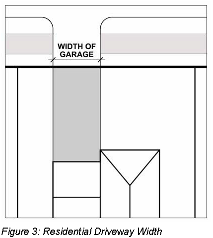 • A residential driveway shall be no wider than the width of the garage. See figure 3 (residential driveway width).