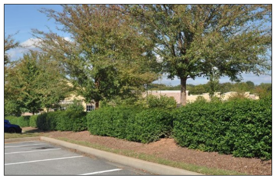 Evergreen trees spaced a maximum of ten to 15 feet on-center, a row of shrubs spaced a maximum of eight feet on-center, and one row of shade trees spaced a maximum of 33 feet on-center.