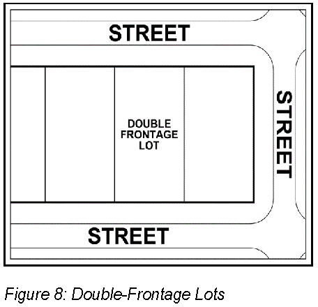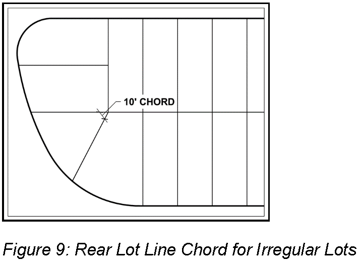 Yard, rear means a yard extending between the side lot lines for the required minimum depth, as specified by the zoning district in which such lot is located, measured perpendicular to the rear lot line. (See Figure 11: Yards) In the case of an irregular or triangular shaped lot, the rear lot line shall be deemed to be a line ten feet in length, within the lot, which is parallel to and at a maximum distance from the front lot line. (See Figure 9: Rear Lot Line Chord for Irregular Lots)