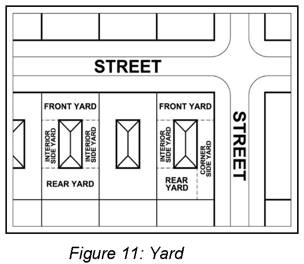 Yard, interior side means a side yard that does not abut a street right-of-way. (See Figure 11: Yards)
