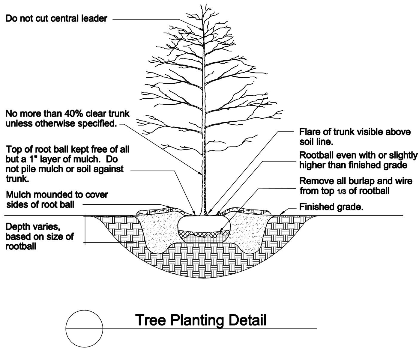 The relationship between caliper, height and root ball size shall meet the ANSI Z60.1 standard, latest edition.