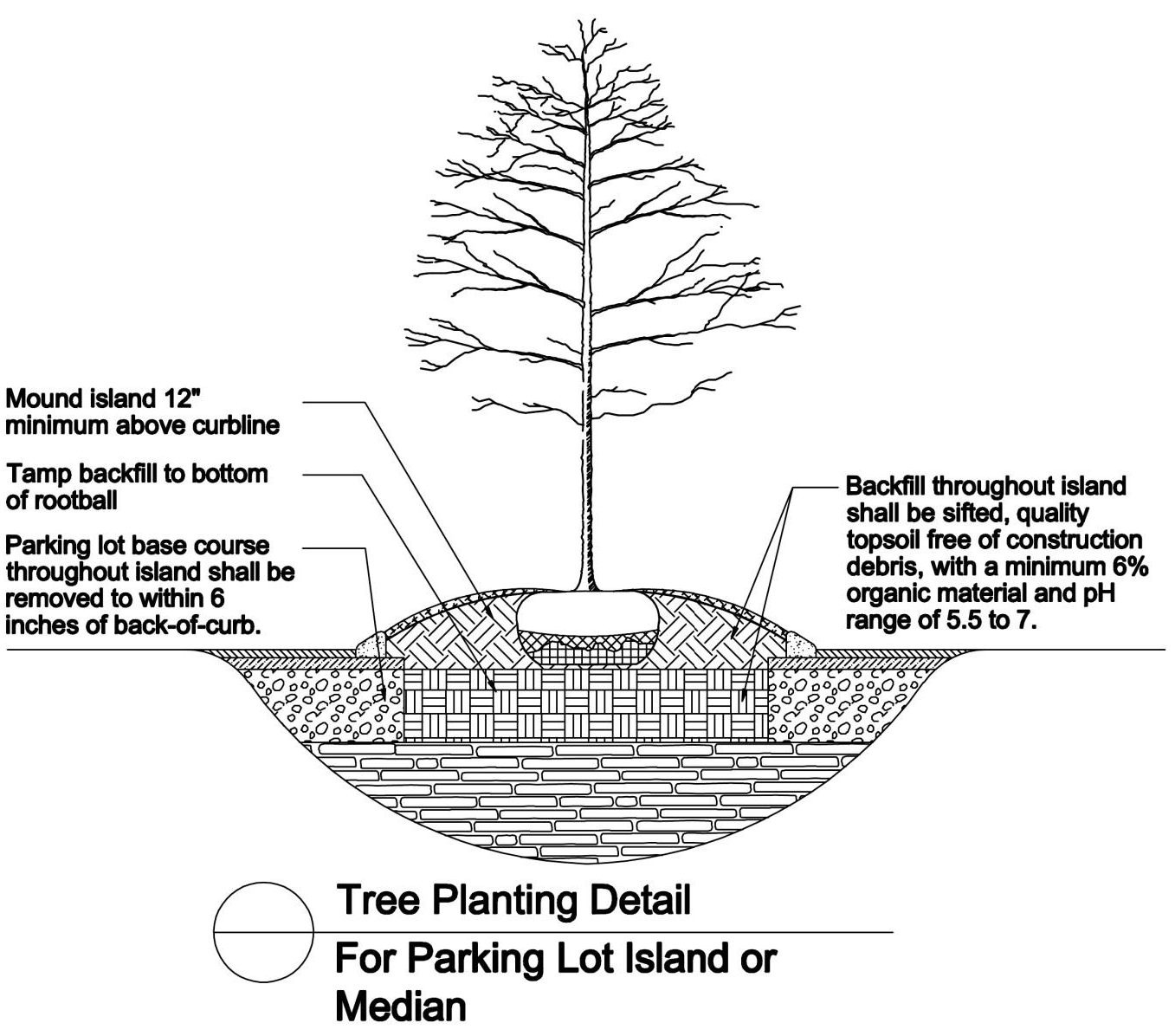 3 inches of mulch shall be applied to cover the sides of the rootball to a point even with the dripline. Do not add any soil to the top of the rootball. Do not add more than 1 inch of mulch to the top of the root ball.