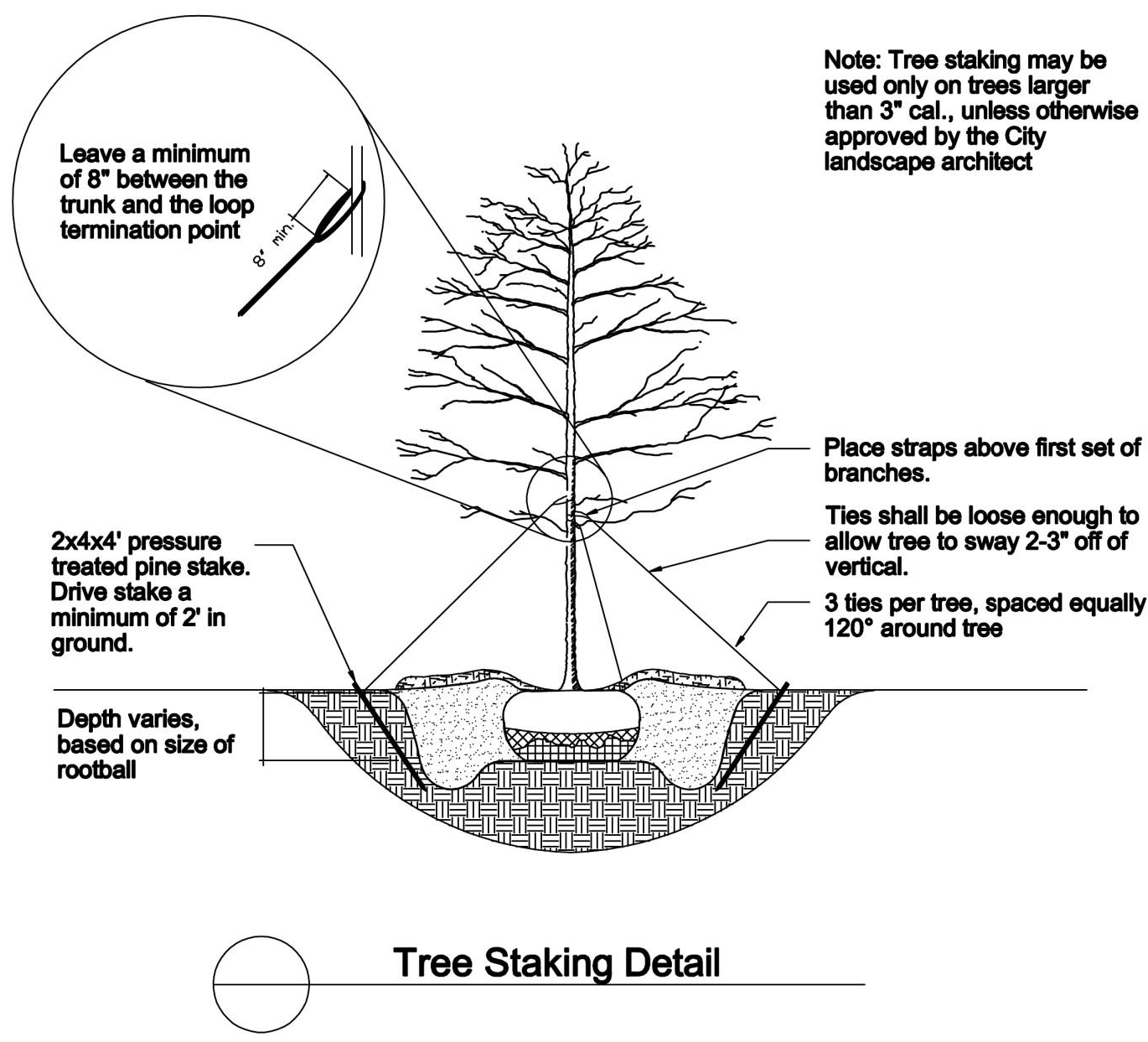 Staking of trees is not allowed unless permission is specifically obtained from the City Planning Department.