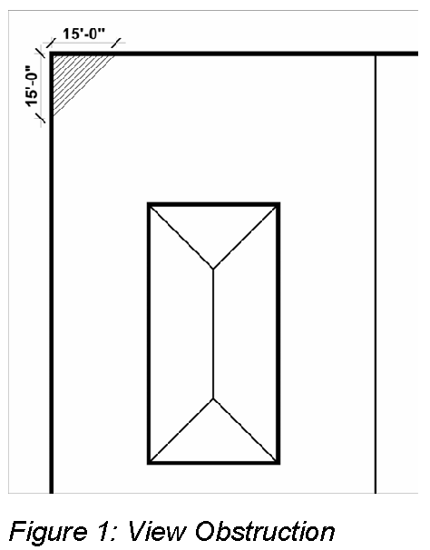 Motorist view obstruction in residential districts. The site clearance area at the intersection of two streets within residential districts shall be defined as a triangular area of a corner lot measured 15 feet from the point of intersection of the property lines of the lot along a street; and shall not be obstructed by any sign, wall, fence, hedge, shrub or other object which exceeds 24 inches in height. Trees may be maintained within this area as long as there is no foliage within 48 inches as measured from the ground to the lowest foliage. In the event that the grade of a lot is higher than the street grade, the height of the wall, fence, hedge, or shrub shall be reduced so that the site clearance is not obstructed 24 inches over the grade of the street. See Figure 1: View Obstruction.