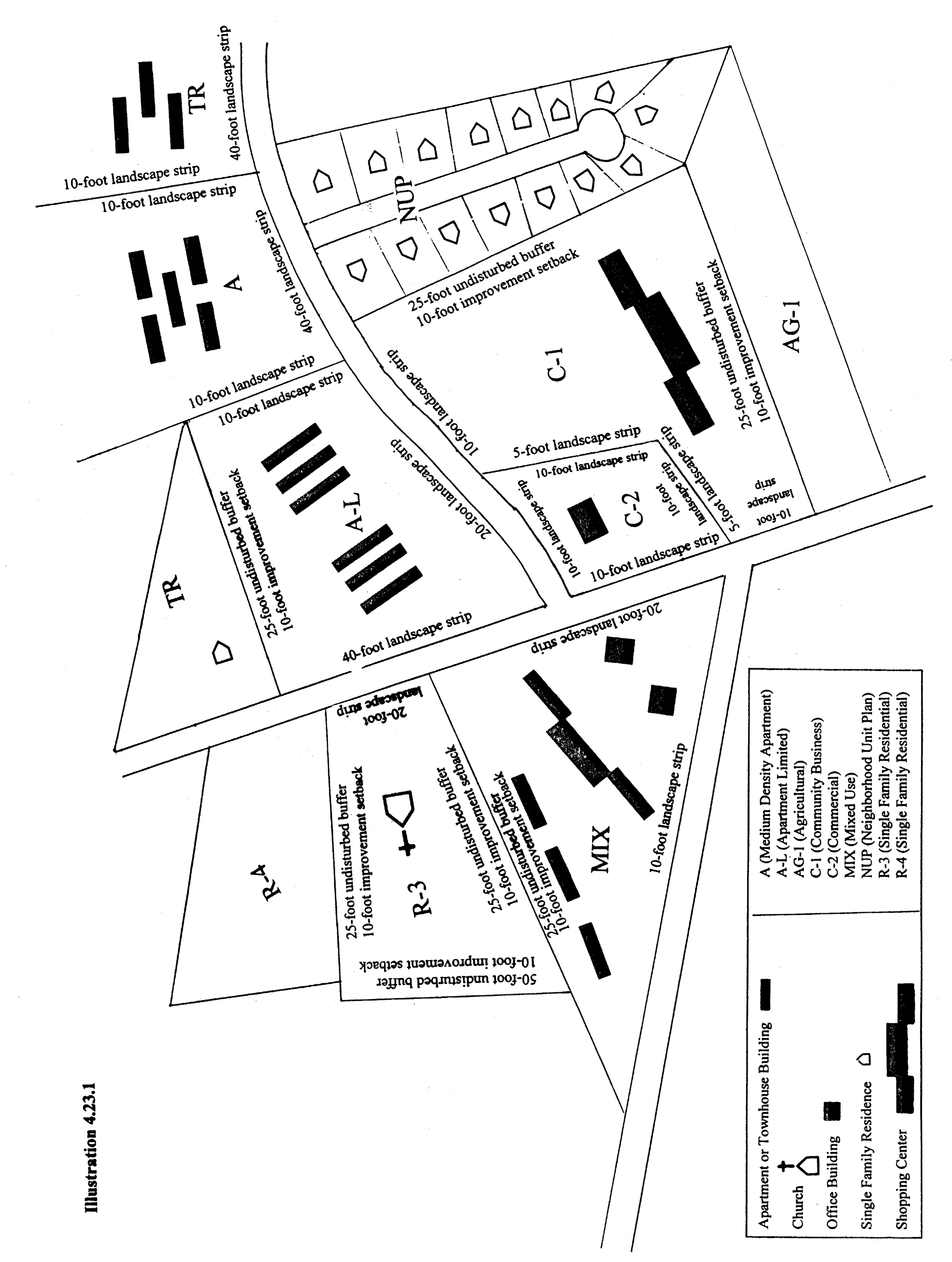 TR, A and A-L zoned districts shall provide landscape areas adjacent to TR, A, and A-L zoned districts, as specified in Table 4.23.1, unless adjacent properties are developed with single-family residential uses. If adjacent properties are developed with single-family residential uses, zoning buffers are required as specified in Table 4.23.1. (See Illustration 4.23.1)
