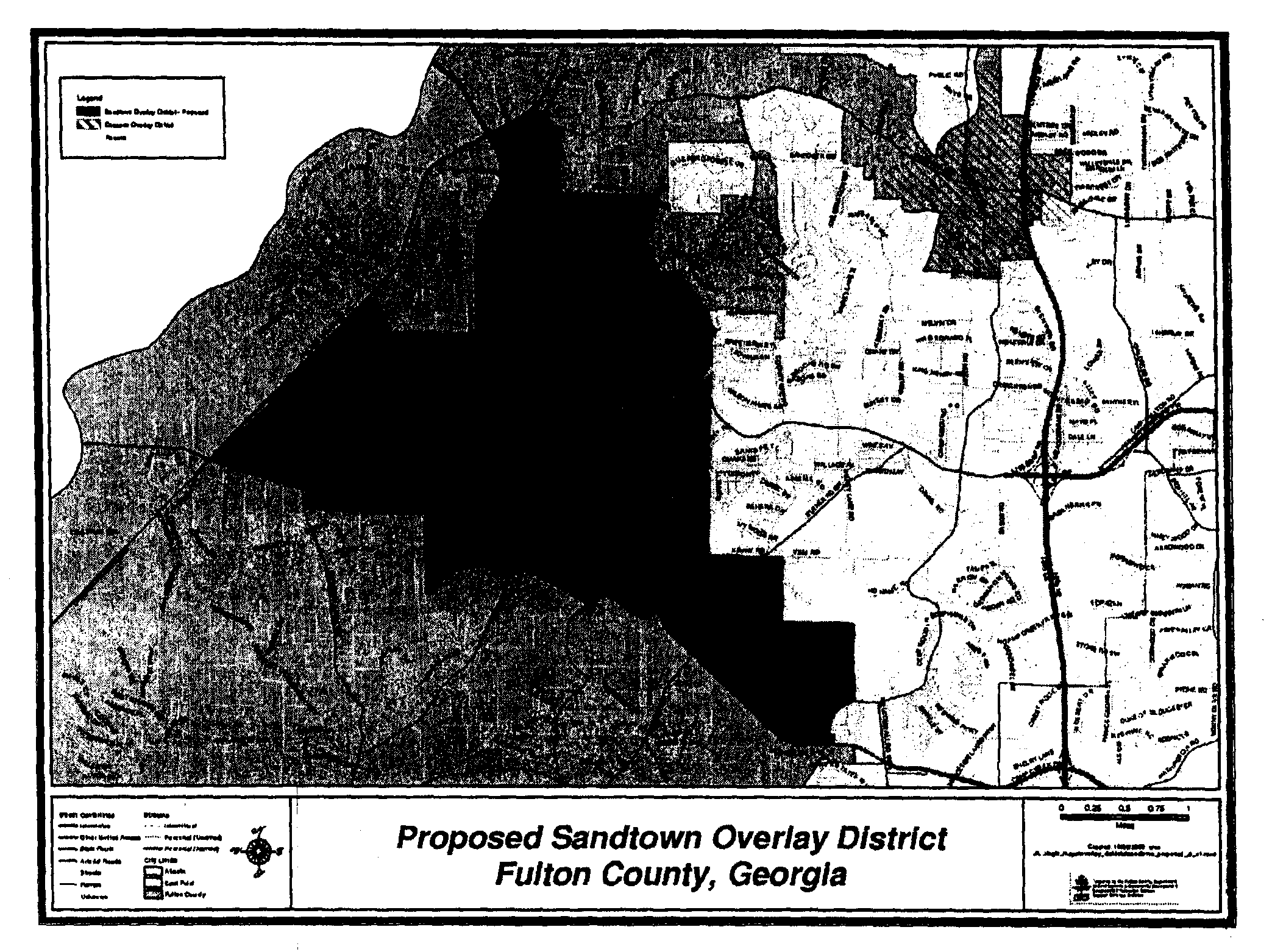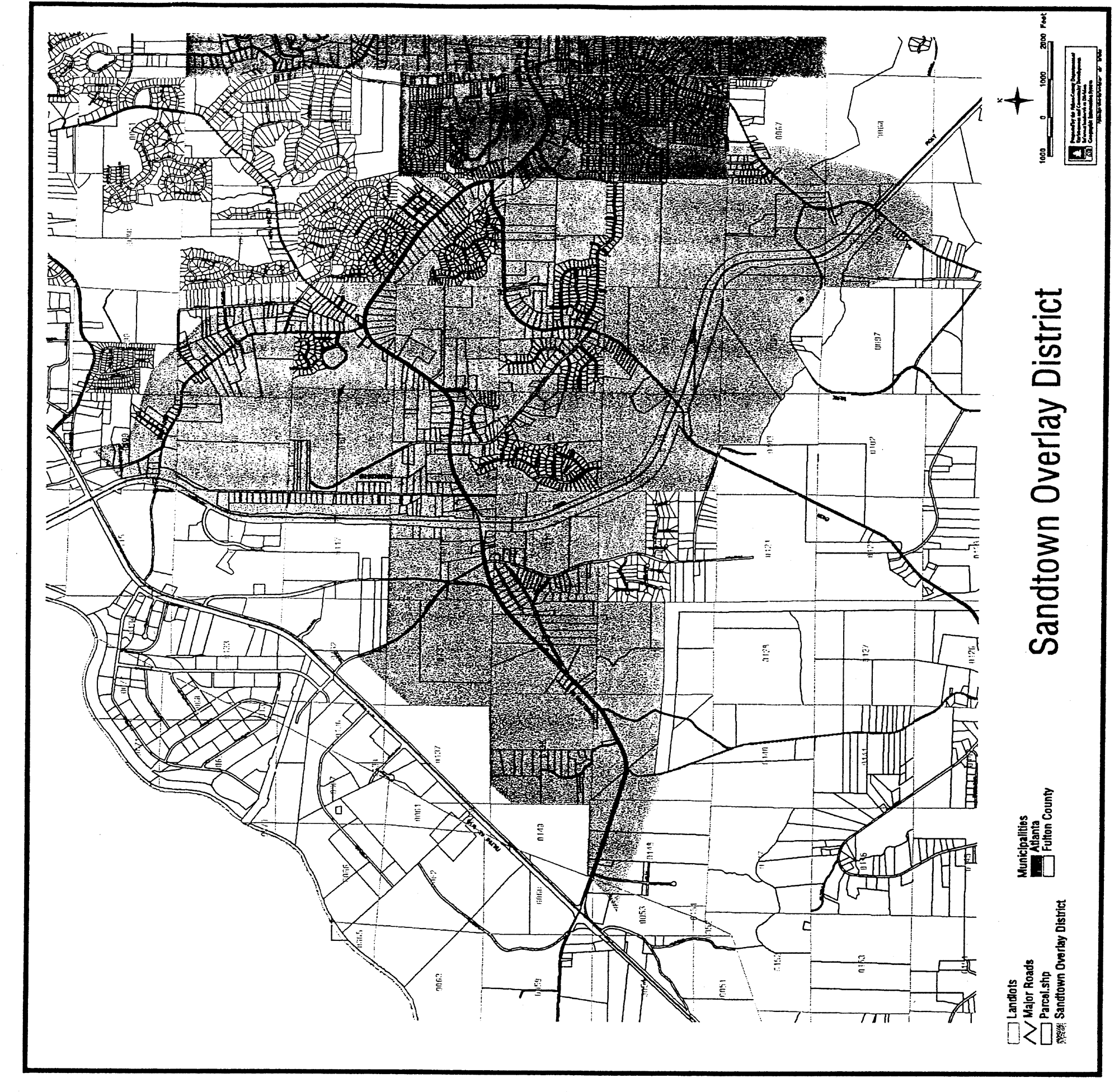 The Sandtown Overlay District applies to all properties zoned or developed for nonresidential and residential uses as illustrated on the map below. Single-family developments are exempted except for compliance with section 12F.4.A. (Buffers and Landscaping). Single-family units not part of a subdivision are exempt from this ordinance. Within the Sandtown Overlay District, land and structures shall be used in accordance with the standards of the underlying district.