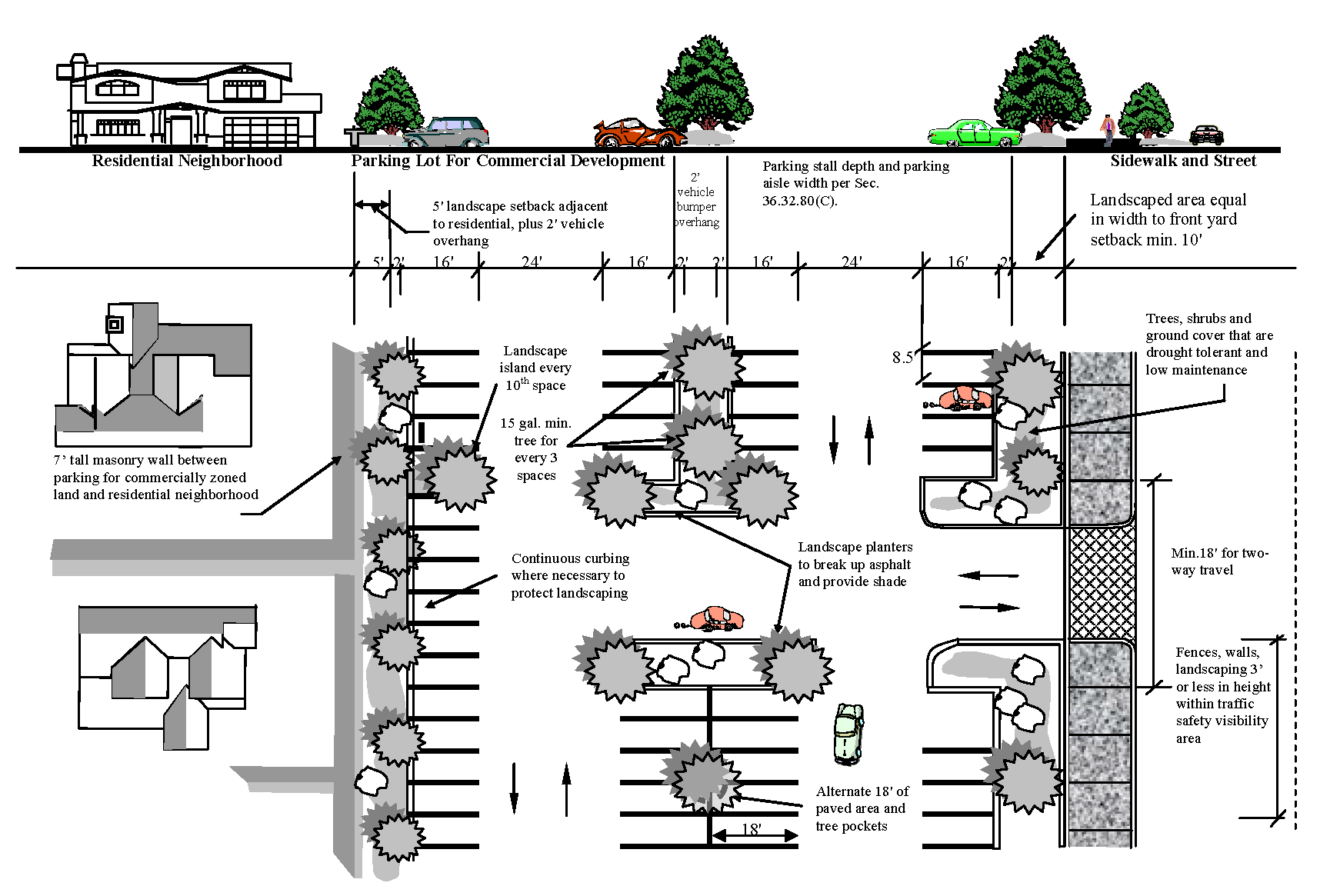 Protect neighborhoods by providing adequate parking and landscaped buffers; and