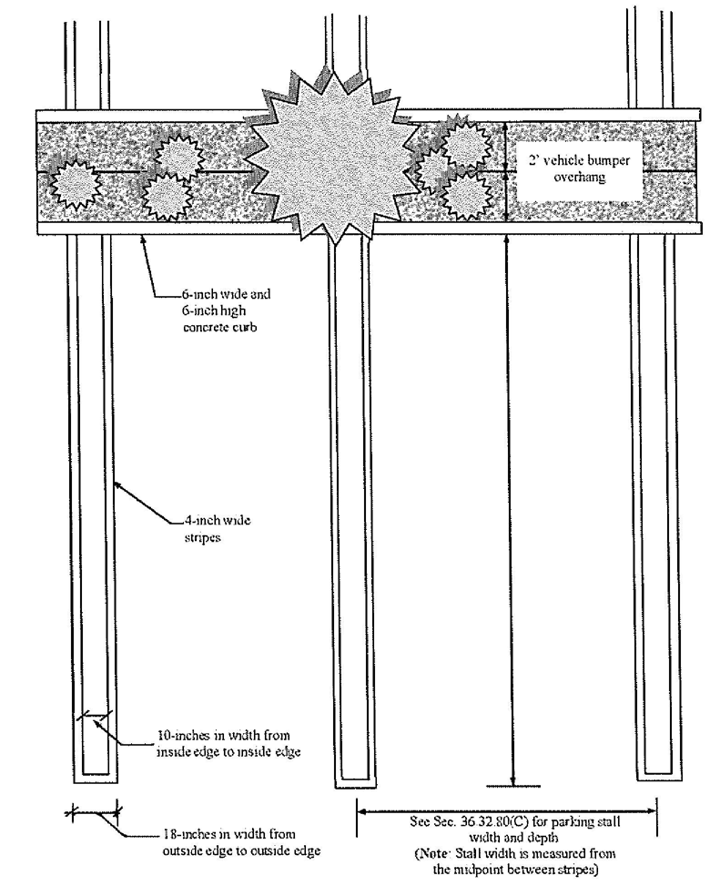 Striping. Parking stalls shall be identified by four (4) inch wide stripes of paint, or other durable striping material approved by the zoning administrator, on the parking lot surface. All parking stalls shall be clearly outlined with double stripes (see Figure 36.32-2, Parking stall striping), except parallel spaces which may be marked with single lines.