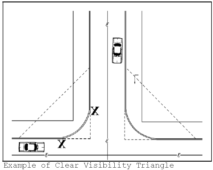 The clear visibility triangle shall be formed by extending a line from the back of the curb or the edge of pavement of two intersecting roadways to a point of intersection, measuring a prescribed distance from the point in both directions and drawing the hypotenuse of the triangle (see the following drawing).
