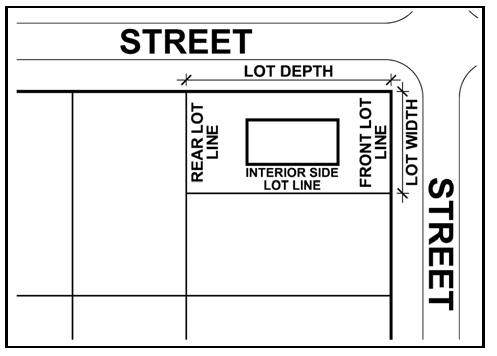 FIGURE 4—STEP 1: On a reverse corner lot, the lot line used to determine the location of the front yard and to measure lot width shall be the shorter street frontage.